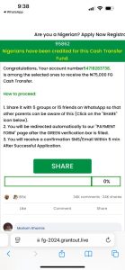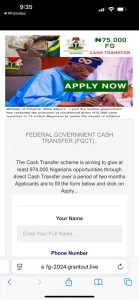This claim is false. The purported ₦75,000 cash transfer scheme is a scam designed to deceive Nigerians into sharing sensitive information and promoting the fraudulent link.