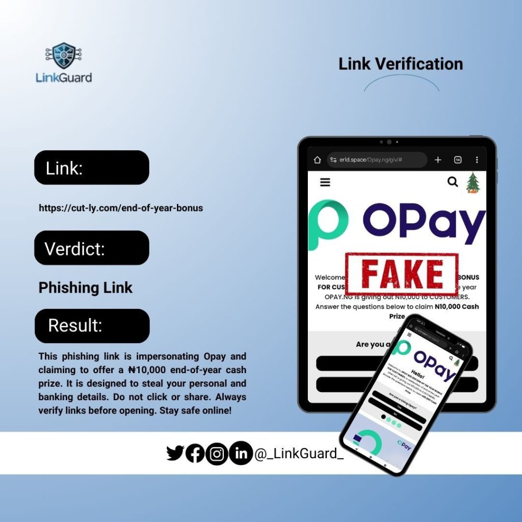 OPay is not running a ₦10,000 End-of-Year Cash Grant for customers in 2025. The message and link are part of a malicious scam campaign aimed at harvesting data and spreading fraud through WhatsApp sharing.