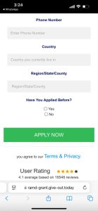 The fraudulent website uses a suspicious URL: Ramd-grant.give-out.today.