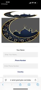 A website (https://Ramd-grant.give-out.today) is circulating online, claiming to offer a Ramadan Relief Package 2025 for Muslims in need. The website asks applicants to provide personal details such as name, country, phone number, and city before submitting their application.