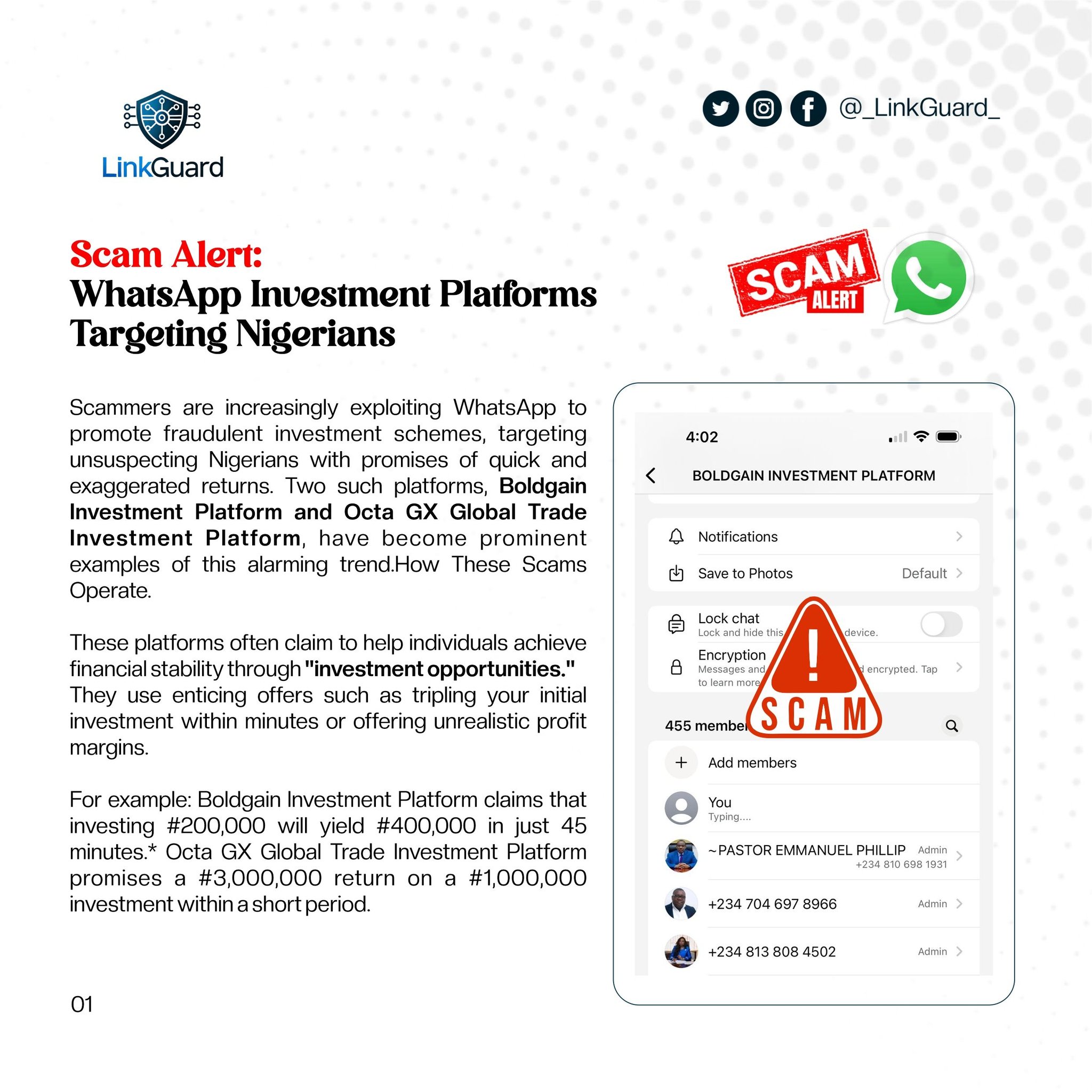 Scammers are increasingly exploiting WhatsApp to promote fraudulent investment schemes, targeting unsuspecting Nigerians with promises of quick and exaggerated returns. Two such platforms, Boldgain Investment Platform and Octa GX Global Trade Investment Platform, have become prominent examples of this alarming trend.
